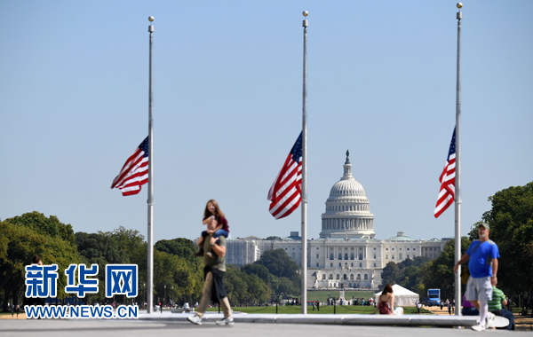 10月2日,在美國首都華盛頓,國會山附近的美國國旗降至旗桿中部。新華社記者 殷博古 攝