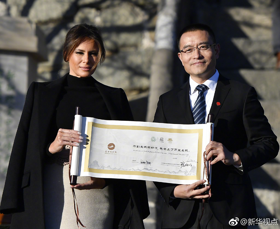 新華網(wǎng)北京11月10日電 11月10日下午,美國(guó)總統(tǒng)特朗普夫人梅拉尼婭登上慕田峪長(zhǎng)城,獲贈(zèng)“好漢證書”。北風(fēng)雖然凜冽,但蜿蜒的長(zhǎng)城氣勢(shì)磅礴,引得梅拉尼婭流連忘返。(記者朱超、燕雁 據(jù)新華社“新華視點(diǎn)”微博報(bào)道)?????