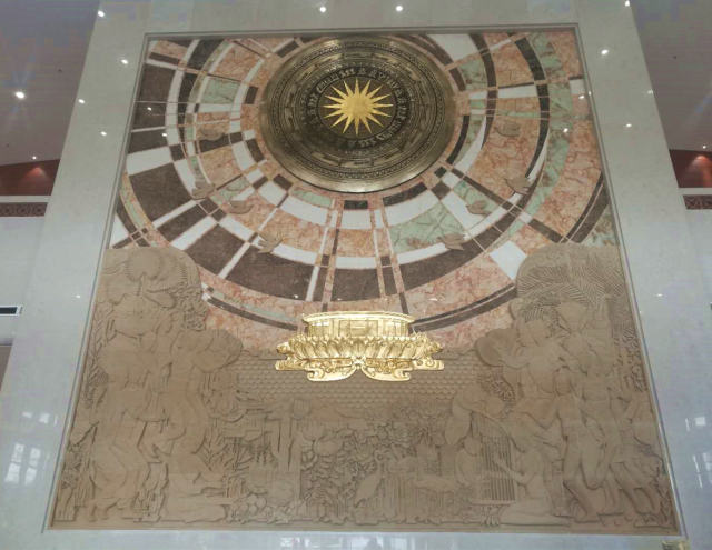 剛剛竣工的越中友誼宮,即將迎來(lái)一場(chǎng)盛大的落成移交儀式。記者抵達(dá)時(shí),花匠們正在門(mén)口精心布置,用鮮花擺出中國(guó)和越南國(guó)旗的式樣。步入大廳,由中央美術(shù)學(xué)院歷時(shí)七個(gè)月設(shè)計(jì)的大型壁畫(huà)《山水相依 友誼長(zhǎng)存》撲入眼簾——核心元素是中越古代共有的樂(lè)器“銅鼓”,寓意兩國(guó)文化交融源遠(yuǎn)流長(zhǎng)。畫(huà)面中下部是身著傳統(tǒng)服飾的中越民眾形象,或翩翩起舞,或引吭高歌,或手捧豐收果實(shí),喜樂(lè)祥和中傳遞著中越之間濃厚的情誼。