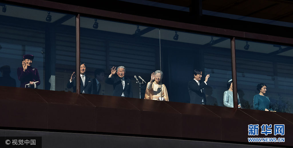 當?shù)貢r間2017年12月23日,日本東京,日本明仁天皇慶祝84歲生日,在皇宮的陽臺上向祝福者揮手致意。(圖片來源:視覺中國)