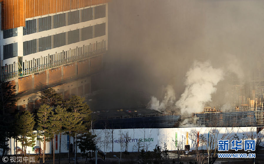 12月25日,韓國(guó)水原市,當(dāng)?shù)匾惶幑⑹┕がF(xiàn)場(chǎng)發(fā)生火災(zāi),現(xiàn)場(chǎng)濃煙滾滾。(圖片來源:視覺中國(guó))