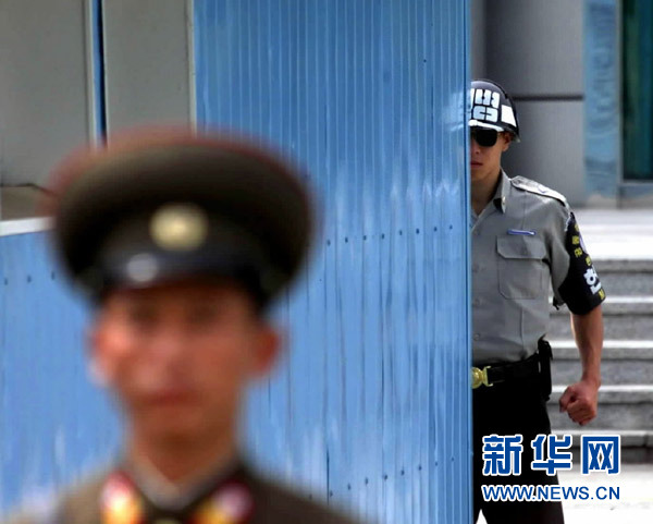 2002年9月19日拍攝的資料照片顯示,一名韓國(guó)憲兵(右)和一名朝鮮人民軍士兵在板門(mén)店朝鮮半島軍事分界線兩側(cè)執(zhí)勤。 新華社記者龔兵攝