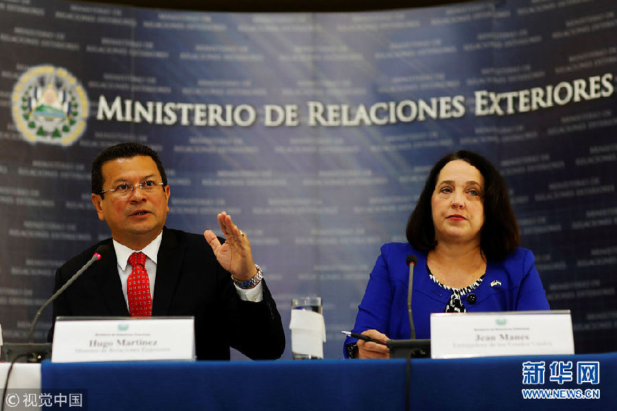 當(dāng)?shù)貢r(shí)間2018年1月8日,薩爾瓦多圣薩爾瓦多,美國(guó)駐薩爾瓦多大使Jean Manes(右)與薩爾瓦多外交部長(zhǎng)雨果·馬丁內(nèi)斯出席新聞發(fā)布會(huì)。(圖片來源:視覺中國(guó))