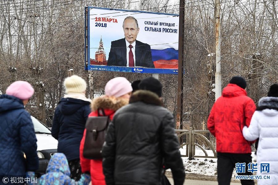 當(dāng)?shù)貢r(shí)間2018年1月15日,俄羅斯葉卡捷琳堡,2018俄羅斯總統(tǒng)大選拉開帷幕,巨大普京海報(bào)矗立街頭。(圖片來源:視覺中國)