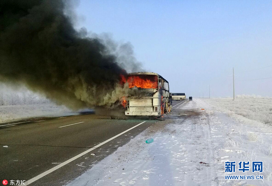 1月18日,哈薩克斯坦阿克托別市(Aktobe),一輛巴士在行駛途中著火,造成至少52人喪生。報道稱只有5名人從著火的車中逃生,遇難者均為烏茲別克斯坦公民。(圖片來源:東方IC)