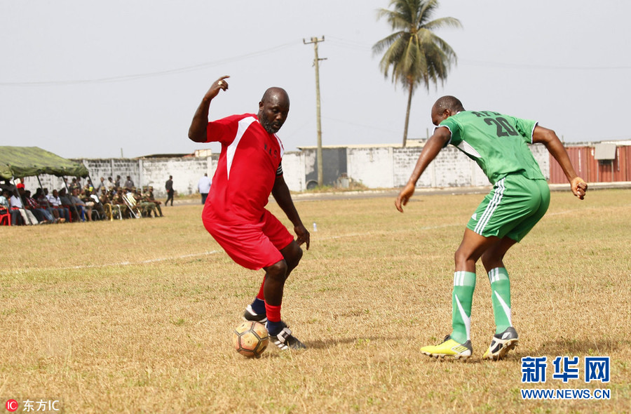 1月20日,利比里亞首都蒙羅維亞,利比里亞當(dāng)選總統(tǒng)、前世界足球先生喬治-維阿參加慈善足球比賽,率領(lǐng)維阿全明星隊(duì)對(duì)戰(zhàn)利比里亞武裝部隊(duì)士兵隊(duì)。喬治-維阿在去年12月27日當(dāng)選利比里亞新一任總統(tǒng),并將于2018年1月22日就職。(圖片來源:東方IC)