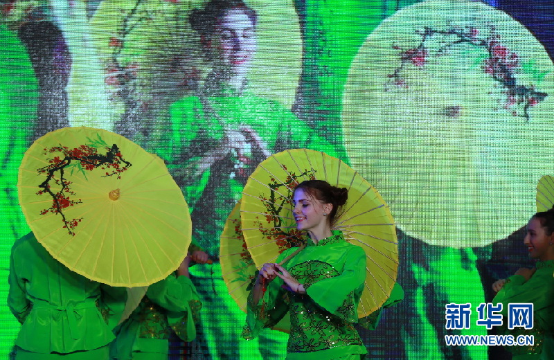 ?。痹拢玻橙?,烏克蘭基輔第一東方語(yǔ)言學(xué)校的學(xué)生表演傘舞。新華網(wǎng)發(fā)(陳俊鋒攝)