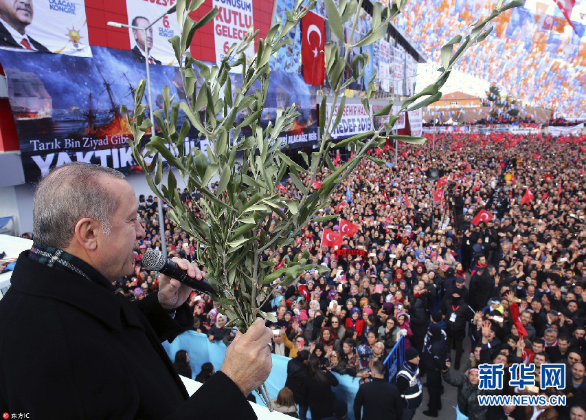 土耳其總統(tǒng)埃爾多安出席集會 手持橄欖枝發(fā)表講話