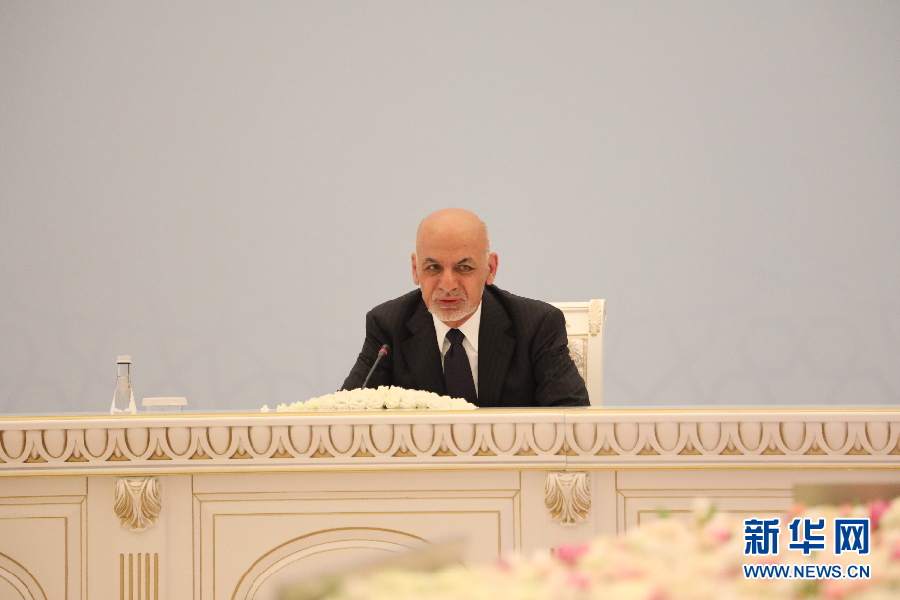 阿富汗總統(tǒng)加尼在會議上發(fā)言。阿富汗問題高級別會議27日在烏茲別克斯坦首都塔什干舉行。新華社記者周良攝