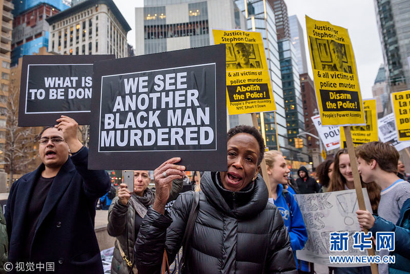 3月28日,美國(guó)紐約,數(shù)百民眾走上街頭參加游行,抗議加州黑人男子克拉克(Stephon Clark)遭警方誤殺。(圖片來(lái)源:視覺(jué)中國(guó))