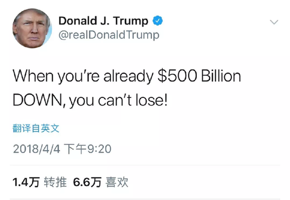 “我們沒有和中國打貿易戰(zhàn),這場戰(zhàn)爭多年前就被當時代表美國的那些愚蠢無能的人打輸了?,F(xiàn)在我們一年有5000億美元的貿易逆差,另有3000億美元知識產權被竊。我們不能讓這一切繼續(xù)!”