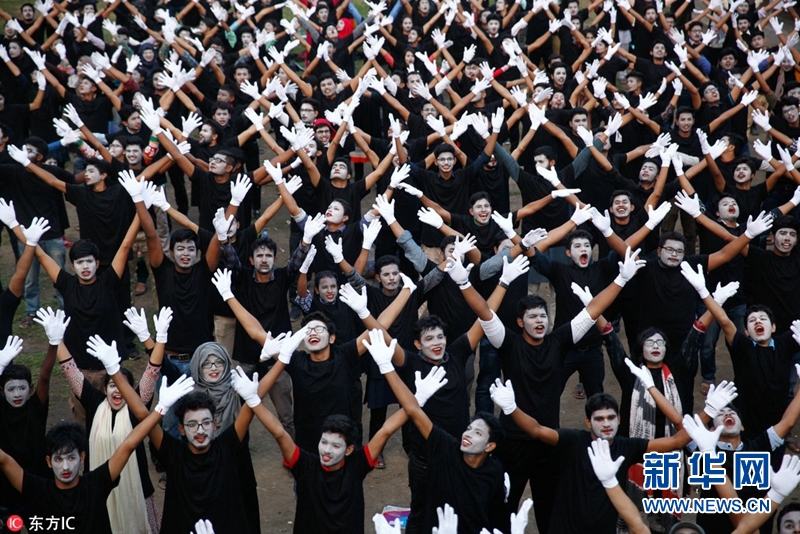 當?shù)貢r間2018年4月8日,孟加拉國達卡,2018年國際啞劇節(jié)在達卡開幕,超過254名啞劇演員齊聚達卡大學參加表演,成為全世界啞劇演員最多的表演節(jié)目,破吉尼斯世界紀錄。(圖片來源:東方IC)
