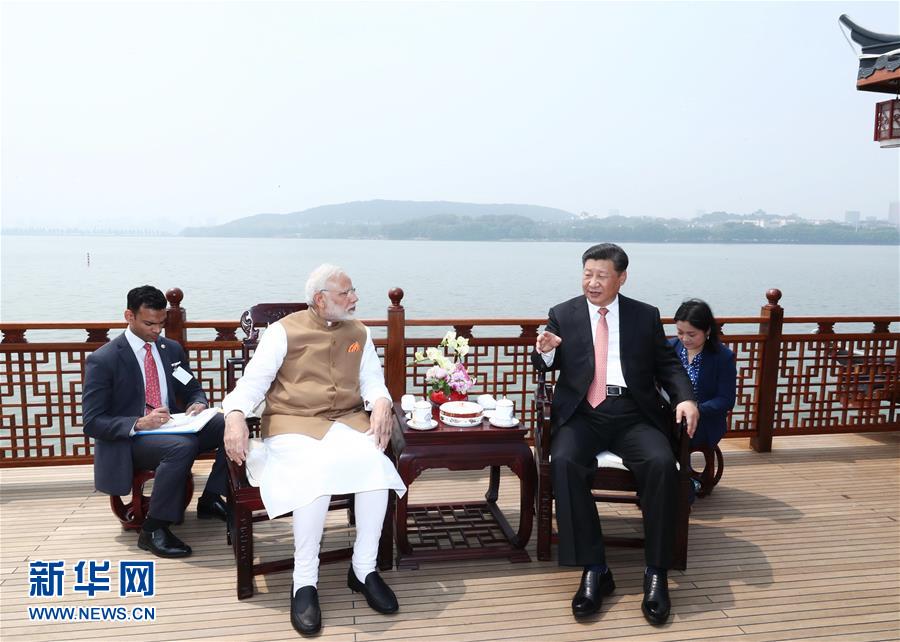 4月27日和28日,國家主席習(xí)近平在武漢東湖賓館同印度總理莫迪舉行非正式會晤。這是4月28日,習(xí)近平同莫迪交談。 新華社記者 龐興雷攝