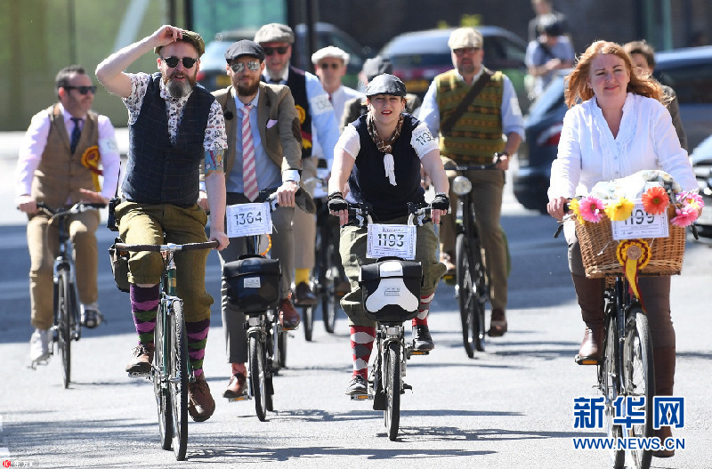 當(dāng)?shù)貢r(shí)間2018年5月5日,英國(guó)倫敦,當(dāng)?shù)嘏e辦復(fù)古騎行活動(dòng),民眾身穿花呢子服裝騎車穿行在倫敦街頭。今年是該活動(dòng)舉辦十周年。(圖片來源:東方IC)