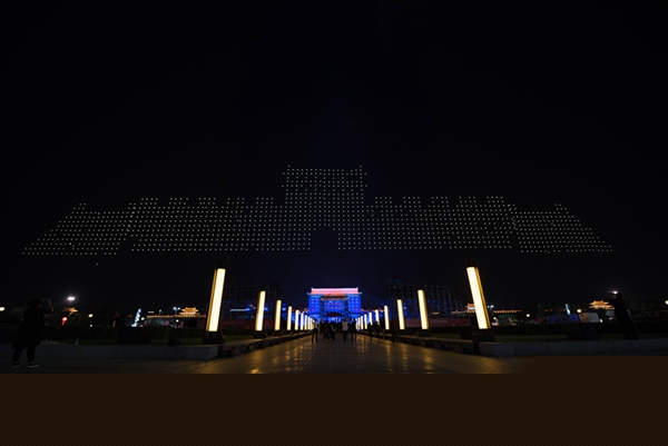 在這段13分鐘的無人機編隊表演中,上千架無人機在夜空化為高科技像素點,組成了一幅長達1200多米的巨幅畫卷,動態(tài)變幻間描繪出西安城墻、絲綢之路、大雁塔等圖案。74架無人機懸掛起74條紅色絲綢,寓意著74個“一帶一路”合作國家和國際組織共同繁榮的風采。西安作為絲綢之路的起點,歷史悠久的十三朝古都,如今也煥發(fā)出“硬科技之都”的新時代風貌。