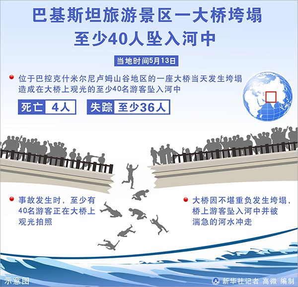 圖表:巴基斯坦旅游景區(qū)一大橋垮塌至少40人墜入河中 新華社記者 高微 編制