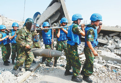 中國維和部隊(duì)官兵在黎巴嫩南部轉(zhuǎn)移未爆航彈。資料照片(新華社發(fā))