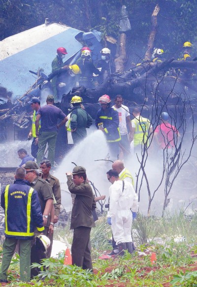 18日,哈瓦那何塞·馬蒂國(guó)際機(jī)場(chǎng)附近,救援人員在墜機(jī)現(xiàn)場(chǎng)工作。新華社發(fā)