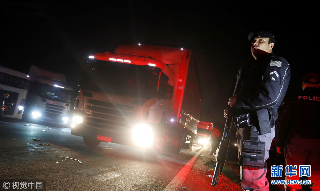 當?shù)貢r間2018年5月26日,巴西圣貝爾納多杜坎普,卡車司機駕車封堵高速公路,抗議油價上漲。(圖片來源:視覺中國)