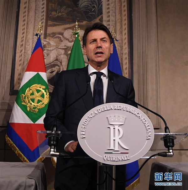 5月27日,在意大利首都羅馬,意新任總理孔特發(fā)表講話。據(jù)當(dāng)?shù)孛襟w報道,孔特27日晚間與總統(tǒng)馬塔雷拉會面并提交擬定的內(nèi)閣成員名單時,馬塔雷拉否決了由意大利聯(lián)盟黨和五星運(yùn)動力推的持疑歐立場的經(jīng)濟(jì)學(xué)家保羅·薩沃納出任財政部長??滋叵蚩偨y(tǒng)提出放棄組閣任務(wù)請求,請求得到總統(tǒng)確認(rèn)。新華社發(fā)(阿爾貝托·林格里亞攝)