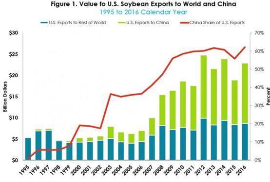 ▲圖為美國從1995年到2016年出口給全世界和中國的大豆情況,可以看到中國是美國大豆產(chǎn)業(yè)中最大且無法替代的市場