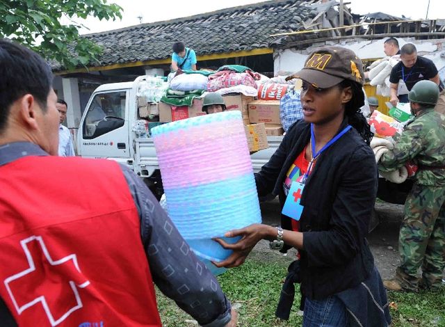 2008年5月17日,在“5·12”汶川特大地震重災(zāi)區(qū)四川省什邡市湔氐鎮(zhèn)白虎頭村,來(lái)自非洲的志愿者瑪利亞在搬運(yùn)救援物資。 新華社記者劉海峰攝