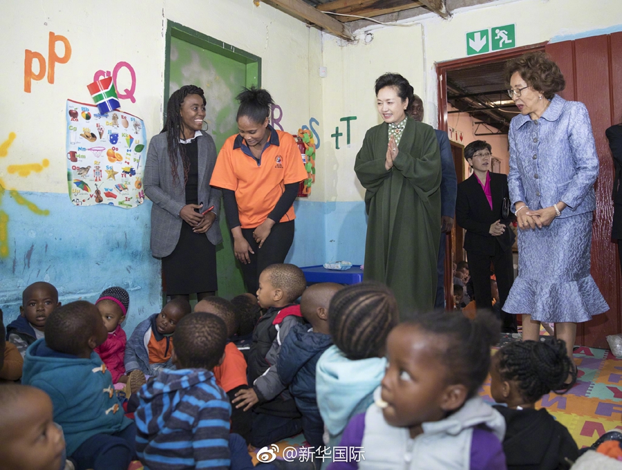 當?shù)貢r間7月24日上午,國家主席習近平夫人、聯(lián)合國教科文組織促進女童和婦女教育特使彭麗媛在南非總統(tǒng)夫人莫采佩陪同下,參觀位于比勒陀利亞東郊的烏坦多社區(qū)托兒所。 新華社記者 王曄 攝