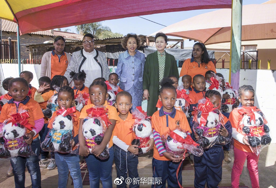 彭麗媛和莫采佩抵達時,非洲自助基金會負責人、托兒所園長等在門口迎接。40名活潑可愛的南非兒童揮舞中南兩國國旗列隊歡迎,彭麗媛俯身同孩子們親切握手問候。彭麗媛來到庭院,20多名兒童手持兩國國旗,輪流用中英文高聲呼喊“歡迎歡迎”。孩子們伴著俏皮輕快的舞蹈動作,合唱英文歌曲《歡迎您》、用中文吟唱中國古詩兒歌《詠鵝》、演唱南非說唱歌曲。彭麗媛認真聆聽,頻頻點頭微笑、不時鼓掌稱贊,夸獎孩子們中文發(fā)音準確。彭麗媛來到教室,觀看兒童繪畫、識字,和孩子們用當?shù)貍鹘y(tǒng)手語互致問候。彭麗媛向孩子們贈送玩具、文具、圖書,并在孩子們自己創(chuàng)作的手印畫上題寫“前程似錦”,勉勵孩子們好好學習、茁壯成長。彭麗媛表示,兒童成長關乎一個國家未來。兒童早期教育,最重要的是樹德育人,引導他們樹立遠大志向、培育美好心靈。希望中南友好事業(yè)從娃娃抓起,讓他們長大后做兩國友好事業(yè)的傳承者和接班人。