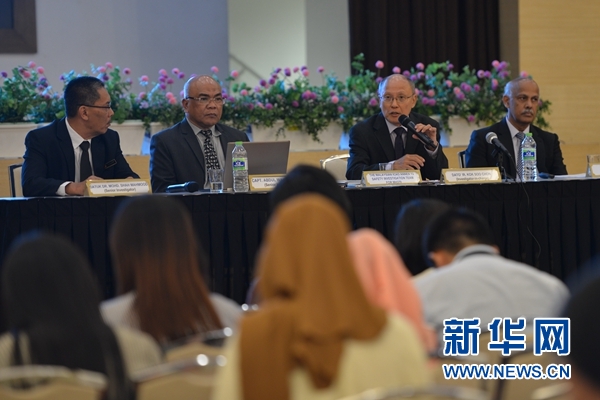 7月30日,馬航370航班客機(jī)安全調(diào)查組負(fù)責(zé)人郭師傳(右二)在馬來西亞普特拉賈亞舉行的新聞發(fā)布會(huì)上講話。 新華社發(fā)(張紋綜攝)