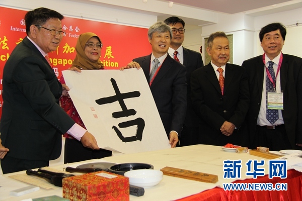 新加坡馬來族女總統(tǒng)哈莉瑪興致勃勃地?fù)]毫?xí)鴮懥藵h字“吉”,并觀賞了書法家代表的現(xiàn)場書法表演。哈莉瑪在賀詞中說,中華書法是眾多新加坡人學(xué)習(xí)的傳統(tǒng)藝術(shù),新加坡書法家協(xié)會通過開設(shè)書法課程和舉辦揮春大會等方式,在新加坡多元文化背景下為加深跨文化交流做出了貢獻(xiàn)。此次國際書法交流大展展出的作品風(fēng)格各異,無疑能帶動(dòng)書法同道的藝術(shù)交流。