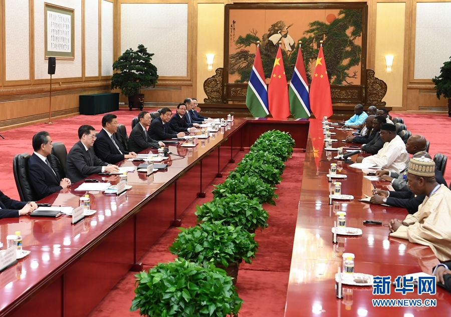 習(xí)近平歡迎岡比亞總統(tǒng)首次出席中非合作論壇會議,指出這對中岡關(guān)系、中非關(guān)系、論壇建設(shè)均具有重要意義。習(xí)近平強(qiáng)調(diào),中岡復(fù)交2年多來,雙方友好合作全面、順利推進(jìn),雙邊關(guān)系發(fā)展得很好、很快,中方對兩國關(guān)系發(fā)展取得的成果感到滿意。中方贊賞總統(tǒng)先生和岡比亞政府堅持一個中國原則,愿同岡方繼續(xù)把握好兩國關(guān)系的大方向,不斷增進(jìn)政治互信,繼續(xù)在涉及彼此核心利益和重大關(guān)切問題上相互堅定支持。中方支持岡比亞政府“建設(shè)新岡比亞”的努力,愿加強(qiáng)務(wù)實合作,擴(kuò)大人文交流。中方支持岡方加強(qiáng)和平安全能力建設(shè)。