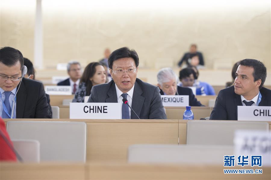 9月14日,在瑞士日內瓦,中國常駐聯(lián)合國日內瓦辦事處和瑞士其他國際組織代表俞建華(中)在會上發(fā)表聯(lián)合聲明。當日,聯(lián)合國人權理事會第39次會議在日內瓦萬國宮開幕。中國代表近140個國家呼吁攜手合作消除貧困、更好促進和保護人權,表達了廣大發(fā)展中國家的心聲,得到發(fā)展中國家熱烈響應。新華社記者徐金泉攝