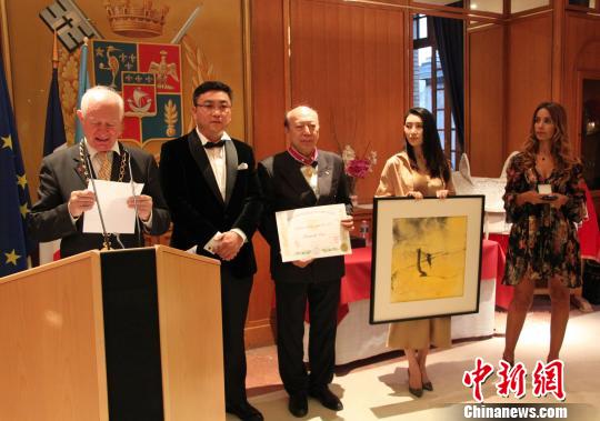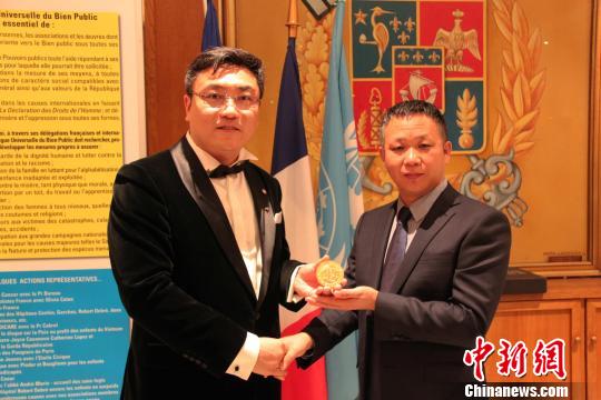9月21日晚,中國(guó)工筆畫家崔景哲(左)在巴黎榮獲全球公益聯(lián)盟文學(xué)(藝術(shù))金質(zhì)勛章,也是此次頒獎(jiǎng)典禮所有獲獎(jiǎng)?wù)咧形ㄒ灰晃恢袊?guó)人。江蘇凱旋體育文化董事長(zhǎng)吳愛(ài)華等知名人士對(duì)崔景哲的獲獎(jiǎng)表示祝賀。李洋 攝