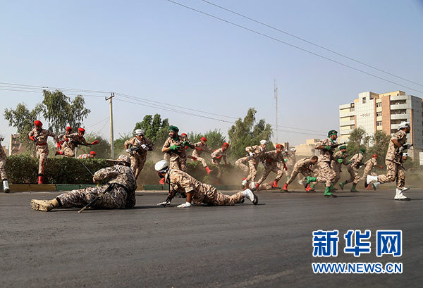 9月22日,在伊朗胡齊斯坦省首府阿瓦士,士兵們躲避襲擊。新華社發(fā)