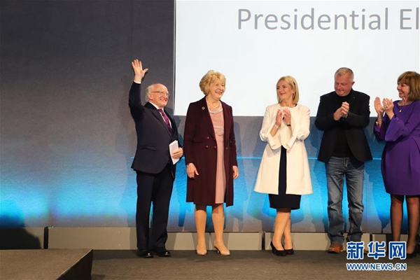 10月27日,在愛爾蘭首都都柏林,希金斯(左一)在總統(tǒng)選舉獲勝后向支持者致意。愛爾蘭總統(tǒng)選舉機(jī)構(gòu)負(fù)責(zé)人27日晚宣布,愛爾蘭現(xiàn)任總統(tǒng)希金斯在26日舉行的選舉中獲勝,再次當(dāng)選總統(tǒng)。新華社發(fā)