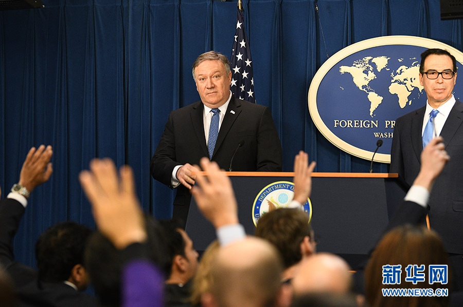 11月5日,在美國(guó)首都華盛頓,美國(guó)國(guó)務(wù)卿蓬佩奧(后左)和財(cái)政部長(zhǎng)姆努欽(后右)出席記者會(huì)。 新華社記者劉杰攝