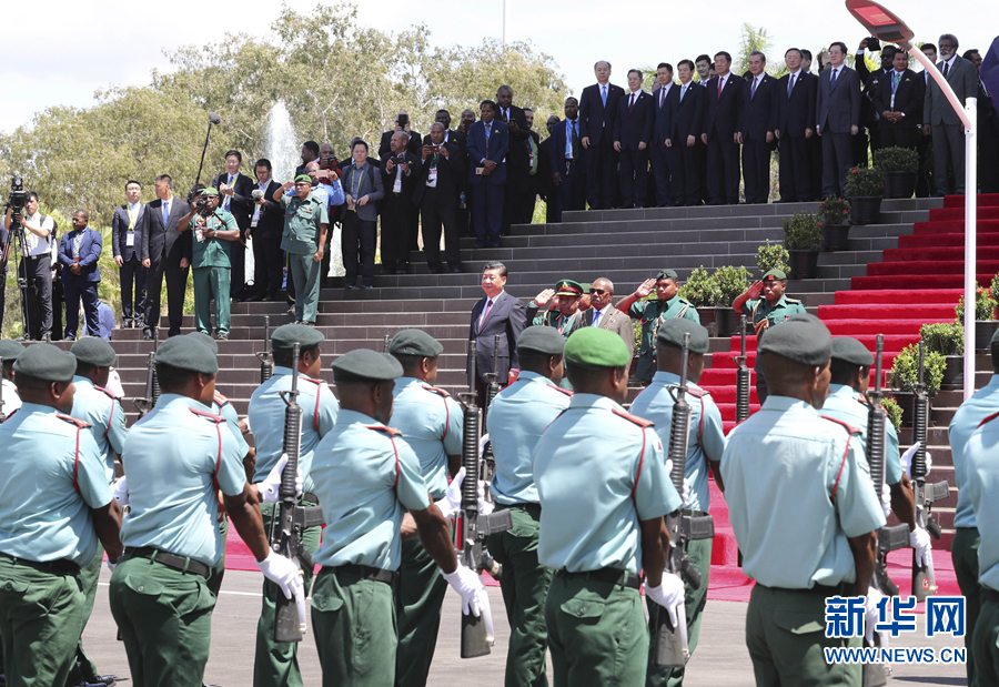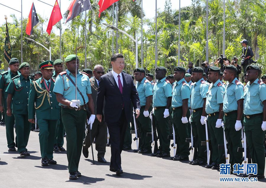 11月16日,國家主席習(xí)近平在莫爾茲比港會見巴布亞新幾內(nèi)亞總督達達埃。會見開始前,達達埃在議會大廈前廣場為習(xí)近平舉行隆重歡迎儀式。新華社記者 費茂華 攝