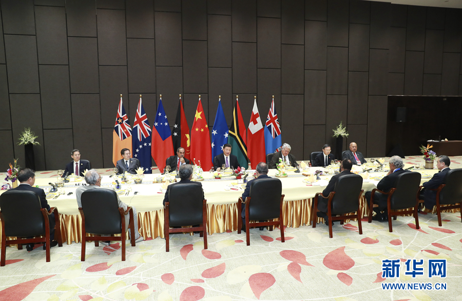 11月16日,國家主席習近平在莫爾茲比港同巴布亞新幾內(nèi)亞總理奧尼爾、密克羅尼西亞聯(lián)邦總統(tǒng)克里斯琴、薩摩亞總理圖伊拉埃帕、瓦努阿圖總理薩爾瓦伊、庫克群島總理普納、湯加首相波希瓦、紐埃總理塔拉吉等建交太平洋島國領(lǐng)導人以及斐濟政府代表、國防部長昆布安博拉舉行集體會晤。習近平主持會晤并發(fā)表主旨講話。 新華社記者 謝環(huán)馳 攝
