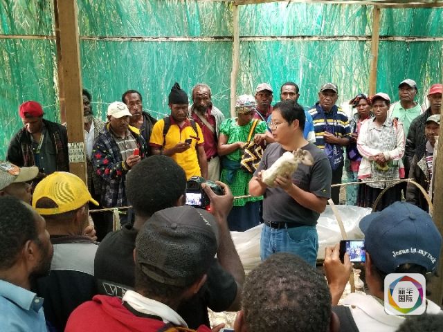 2018年9月4日,在巴布亞新幾內(nèi)亞?wèn)|高地省戈羅卡市中國(guó)福建省援巴新菌草與旱稻技術(shù)合作項(xiàng)目基地,項(xiàng)目組組長(zhǎng)林應(yīng)興向當(dāng)?shù)孛癖娭v解菌草種植技術(shù)。(新華社記者莫華英攝)