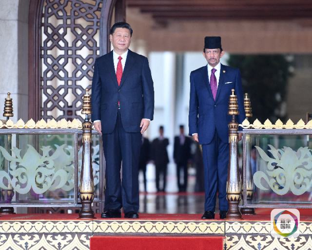 11月19日,國家主席習近平在斯里巴加灣同文萊蘇丹哈桑納爾舉行會談。這是會談開始前,習近平出席哈桑納爾在王宮前廣場舉行的盛大歡迎儀式。 新華社記者 燕雁 攝