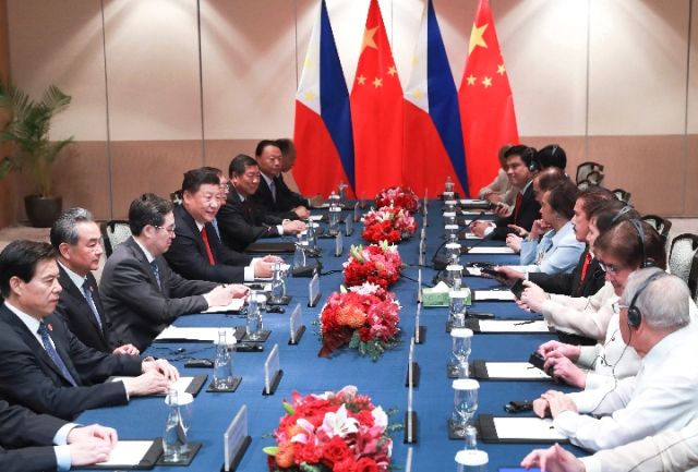 11月21日,國(guó)家主席習(xí)近平在馬尼拉會(huì)見(jiàn)菲律賓眾議長(zhǎng)阿羅約和參議長(zhǎng)索托。新華社記者 龐興雷 攝