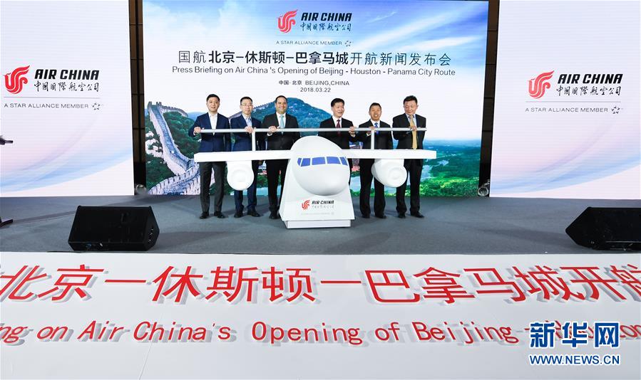 2018年3月22日,嘉賓在北京為北京—休斯頓—巴拿馬城航線開(kāi)通揭幕。中國(guó)國(guó)際航空公司于4月5日開(kāi)通此條新航線。新華社記者 李賀 攝