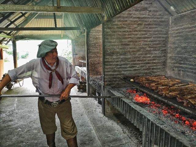 在布宜諾斯艾利斯市郊的圣·蘇珊娜農(nóng)場(chǎng),男主人在為客人制作傳統(tǒng)阿根廷烤肉。(新華社記者王曄攝)