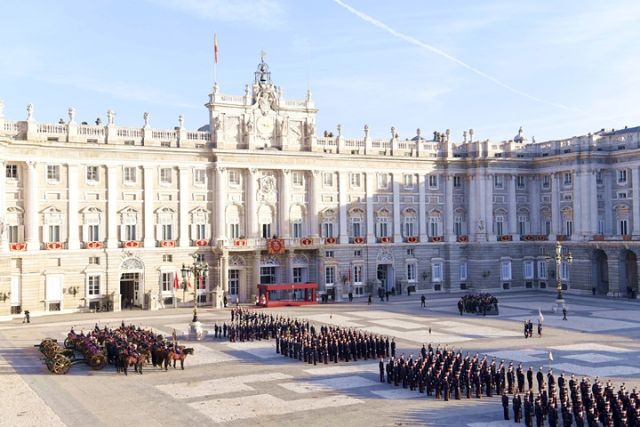三場(chǎng)宴會(huì)之外,令人印象深刻的便是戰(zhàn)機(jī)護(hù)航和在馬德里王宮武器廣場(chǎng)舉行的盛大歡迎儀式。