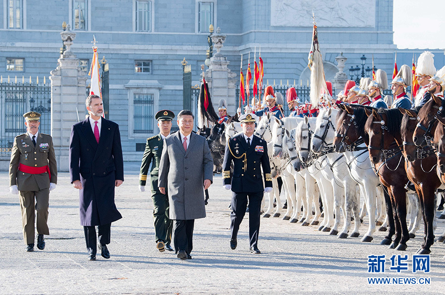 當(dāng)?shù)貢r(shí)間11月28日,國(guó)家主席習(xí)近平在馬德里出席西班牙國(guó)王費(fèi)利佩六世舉行的隆重、盛大的歡迎儀式。這是習(xí)近平在費(fèi)利佩六世國(guó)王陪同下檢閱騎兵方隊(duì)。(新華社記者李學(xué)仁攝)