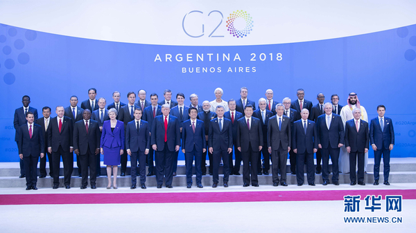 當?shù)貢r間11月30日,二十國集團領導人第十三次峰會在阿根廷布宜諾斯艾利斯舉行。國家主席習近平出席第一階段會議并發(fā)表題為《登高望遠,牢牢把握世界經(jīng)濟正確方向》的重要講話。這是習近平同其他與會領導人合影。 新華社記者 李濤 攝