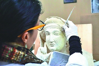 12月5日,在敘利亞首都大馬士革,文物修復(fù)師赫芭·朱馬在國家博物館內(nèi)修復(fù)來自巴爾米拉的受損雕像。新華社發(fā)