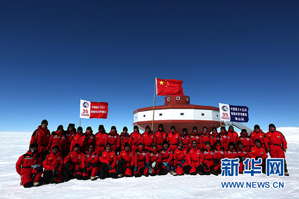 12月26日,中國第35次南極科學(xué)考察隊(duì)內(nèi)陸隊(duì)(泰山隊(duì)和昆侖隊(duì))隊(duì)員在泰山站主體建筑前升國旗合影。 新華社記者 劉詩平 攝