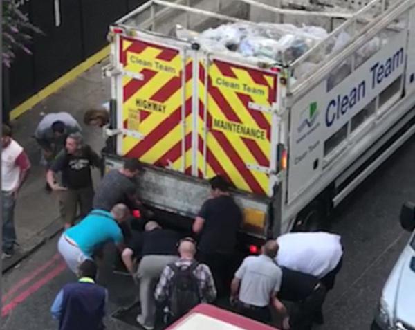 7月26日,在英國倫敦,老人被困垃圾車下。15名熱心民眾合力抬起垃圾車,幫助老人脫險(xiǎn)。