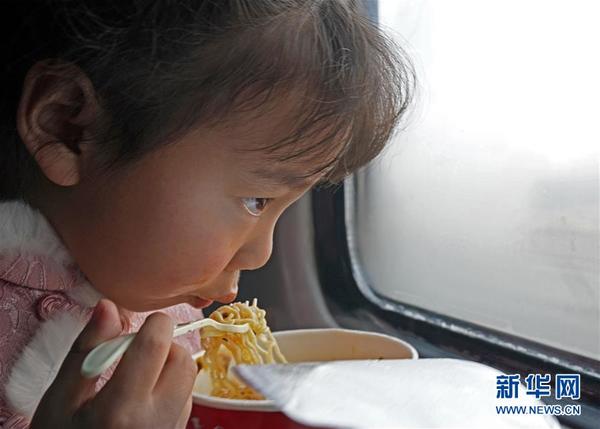 1月21日,在中國(guó)鐵路哈爾濱局集團(tuán)有限公司齊齊哈爾客運(yùn)段K497次列車(chē)上,一名小女孩在窗邊吃方便面。 新華社記者 才揚(yáng) 攝